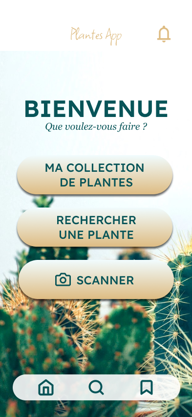 Depuis la page d’accueil, tout est accessible. Les utilisateurs ont le choix entre utiliser les gros boutons de l’accueil ou bien le menu de navigation. J’ai essayé de faire le plus direct possible afin que ce soit rapide. L’app permet de : consulter ses plantes, explorer de nouvelles plantes, ou tout simplement scanner la plante qu’ils ont devant leurs yeux.