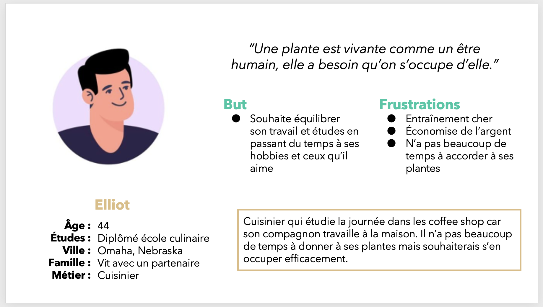 Elliot est un cuisinier qui a besoin d’une app pour ses plantes parce qu’il n’a pas le temps d’en prendre soin correctement.