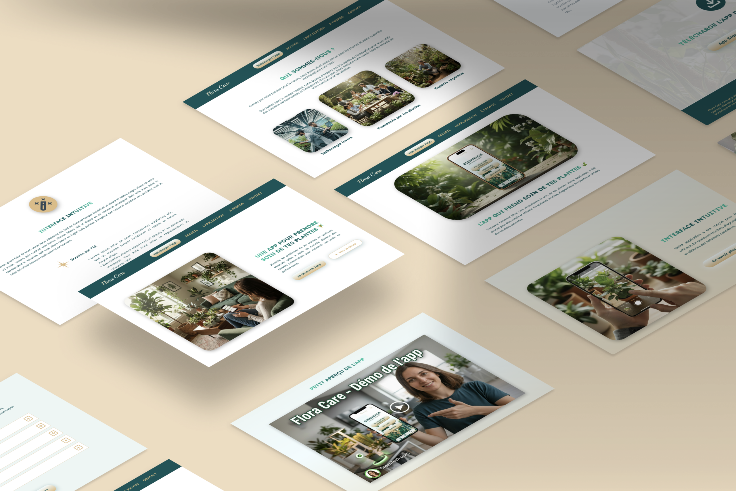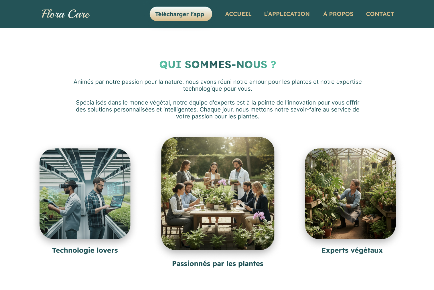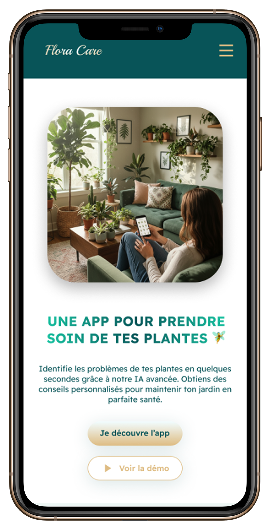 Créer un site web pour présenter l’application Flora Care, une app boostée par l’IA, qui t’aide à prendre soin de tes plantes sans te prendre la tête.