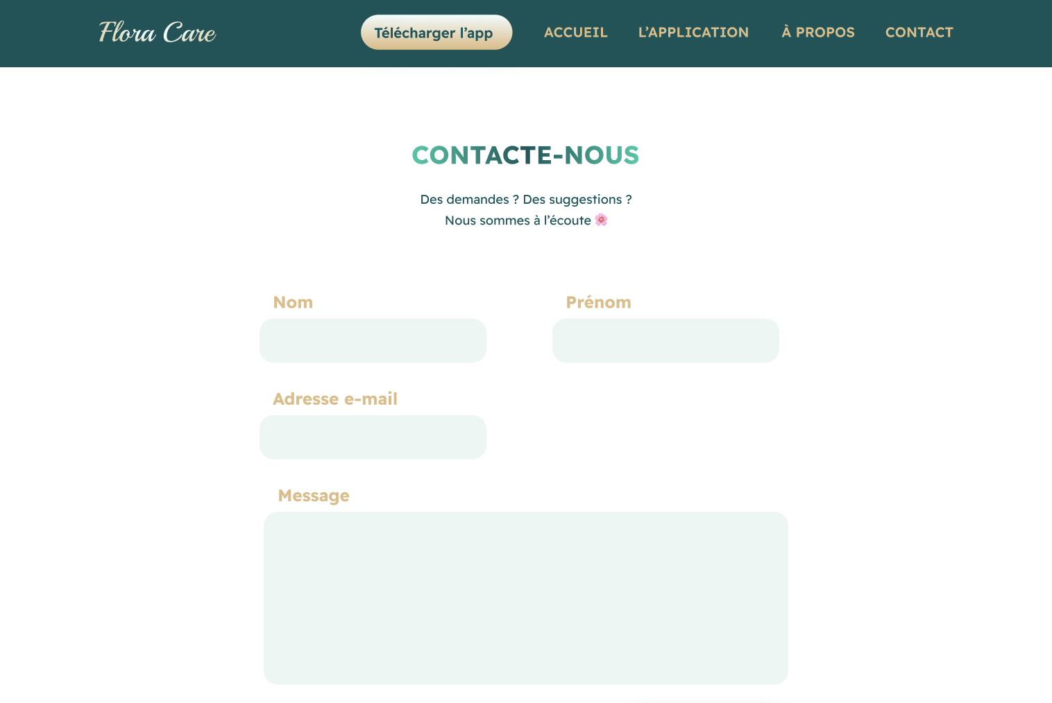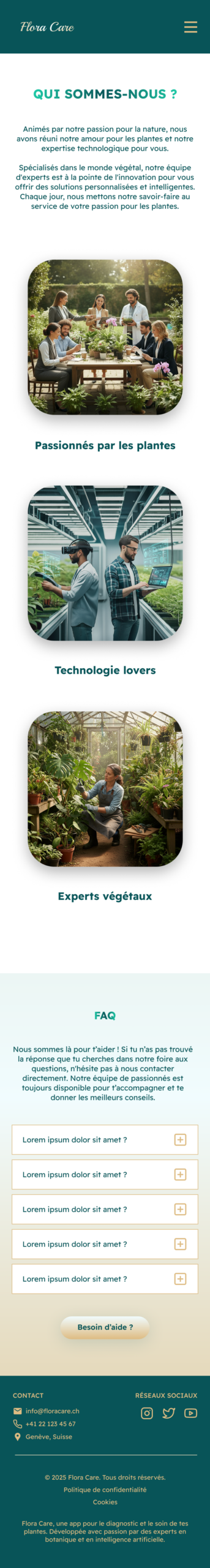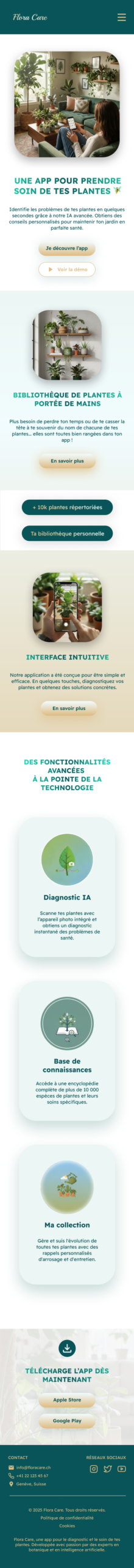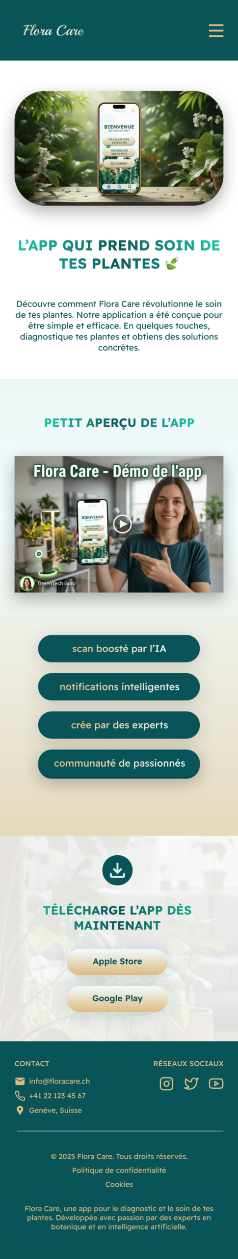Créer un site web pour présenter l’application Flora Care, une app boostée par l’IA, qui t’aide à prendre soin de tes plantes sans te prendre la tête.